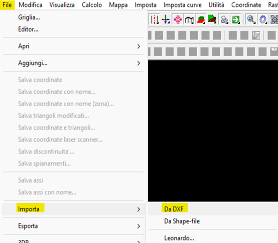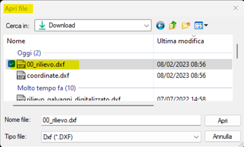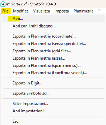 - Da questa entità grafica cliccare su “File” / “Apri” e si va a selezionare il file in formato Dxf;
