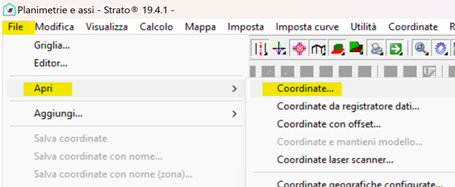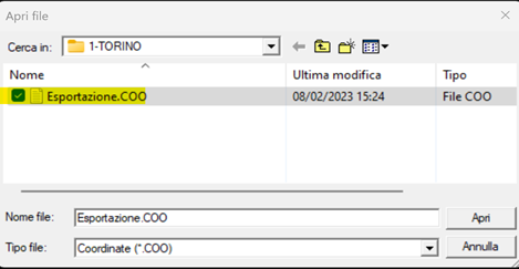 -Cliccare su “File” / “Apri” / “coordinate” e selezionare il file .coo appena salvato nell’entità grafica.