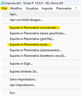 Se, per esempio, si stanno esportando punti, curve di livello o discontinuità” sarà necessario “Esportare in planimetrie (coordinate)”, se invece stiamo esportando un asse sarà necessario “Esportare in Planimetrie (asse)”.