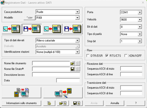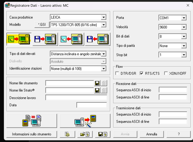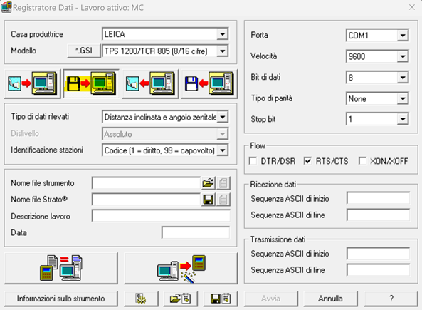 In questo caso non sarà necessario compilare la parte relativa ai dati dello strumento: porta, velocità ecc, mentre per i dati della casa produttrice, del modello, il tipo di dati rilevati, il dislivello e l’identificazione delle stazioni, valgono le stesse condizioni spiegate in precedenza. Nella sezione “Nome file Strumento” il file non è più in scrittura ma in apertura (come possiamo notare dal simbolo della cartella gialla), di conseguenza sarà necessario caricare il file scaricato dallo strumento che è stato già precedentemente elaborato dal programma in dotazione alla strumentazione.