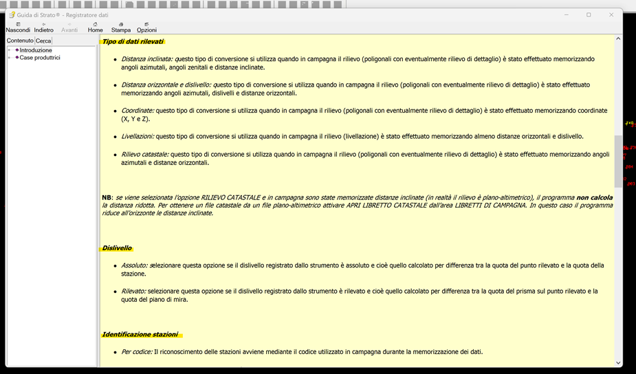Inoltre, è possibile avere spiegazioni riguardanti il “Tipo di dati rilevati”, “Dislivello” e “Identificazione stazioni” che sono dati del registratore dati da compilare.