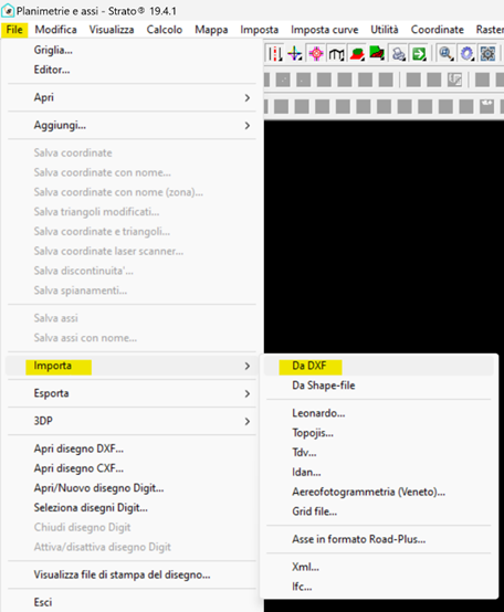 Come prima operazione, una volta creato il nuovo progetto, si va ad importare il rilievo da Dxf dall’area grafica “Planimetria ed assi”