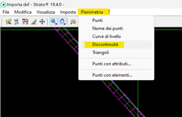 Sono presenti diversi modi per importare il contenuto del file, uno dei quali è l’utilizzo del comando "Planimetria" da dove andiamo a selezionare la tipologia degli oggetti che si vanno ad importare. In questo caso sarà necessario cliccare su "Discontinuità" e andare a selezionare una linea della galleria.