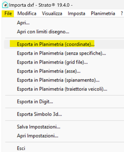 Successivamente esportare le sezioni cliccando su "File" / "Esporta in Planimetrie coordinate".