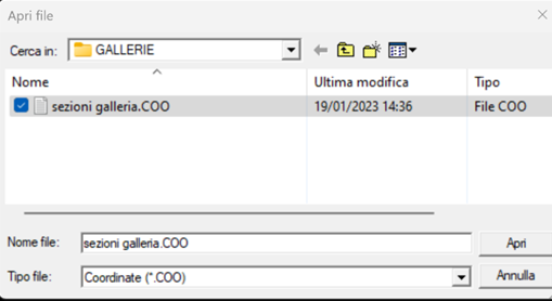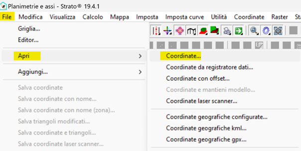da dove è possibile importare il file .coo del rilievo appena salvato da "File" / "Apri" / "Coordinate".