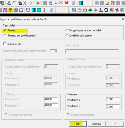 Successivamente cliccare su "Esporta profili e sezioni estratti in profili”, indicare “terreno” e dare l’ok.