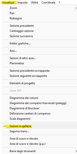 Dall’area grafica sezioni, è possibile visualizzare le sezioni in galleria che sono state precedentemente elaborate ed esportate nel modulo sezioni attraverso il comendo “Visualizza” / “Sezioni in galleria”.
