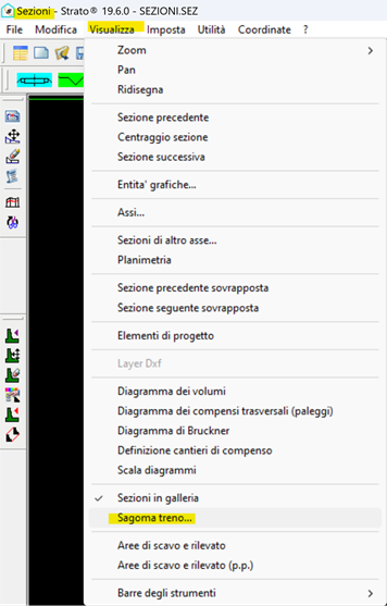 Una volta inserita la corretta sezione tipo, è possibile andare a visualizzare nel modulo sezioni, la sagoma del treno da “Visualizza” / “Sagoma treno”
