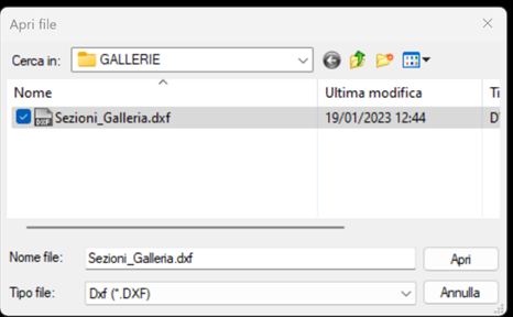 -Dal modulo sezioni in galleria cliccare su “File” / “Importa da dxf”