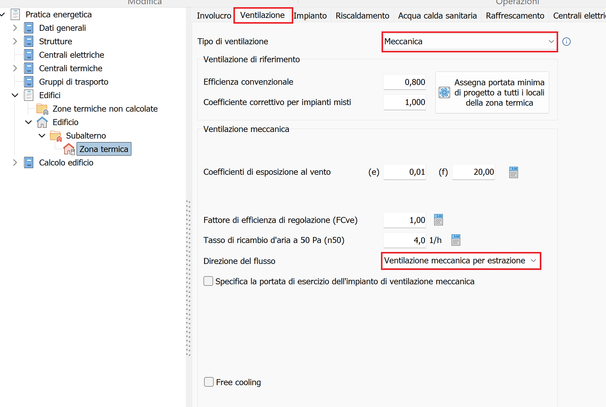 Per inserire degli estrattori d'aria in Termo, si deve accedere alla sezione Ventilazione della zona termica interessata e selezionare "ventilazione meccanica" anziché naturale.