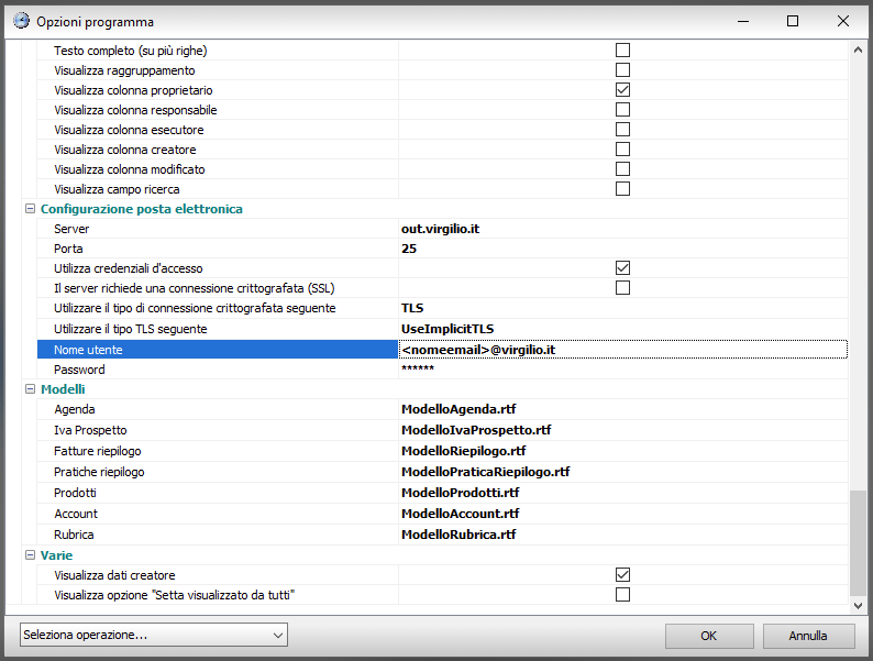 Se, invece, si utilizza, per esempio, un account Virgilio, i dati della posta vanno configurati in questo modo (il nominativo "<nomeemail>" è da sostituire con quello personale):
