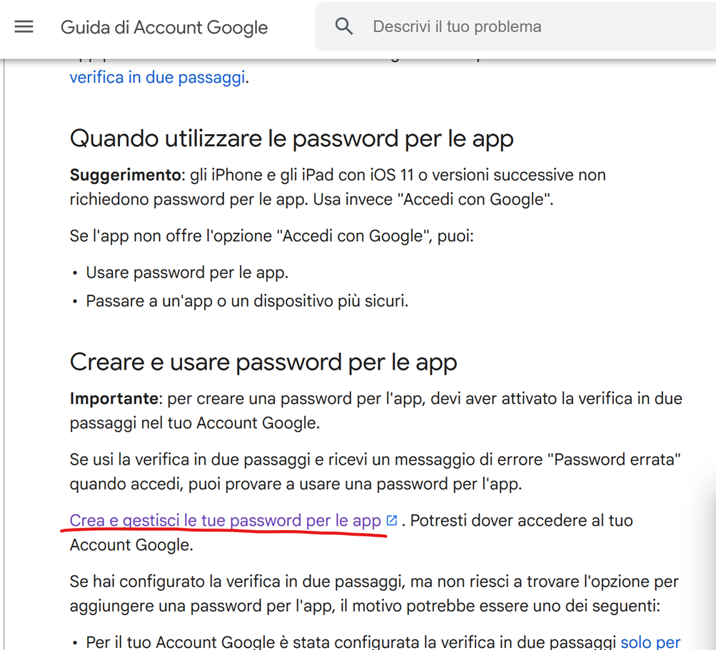 Bisogna quindi creare una password per l’App e ciò richiede che per il proprio account Gmail sia attiva la verifica a 2 fattori.