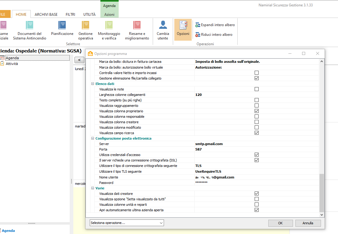 I dati della posta elettronica si compilano all'interno delle Opzioni del programma (menu Home) nella sezione dei dati relativi alla "Configurazione posta elettronica":